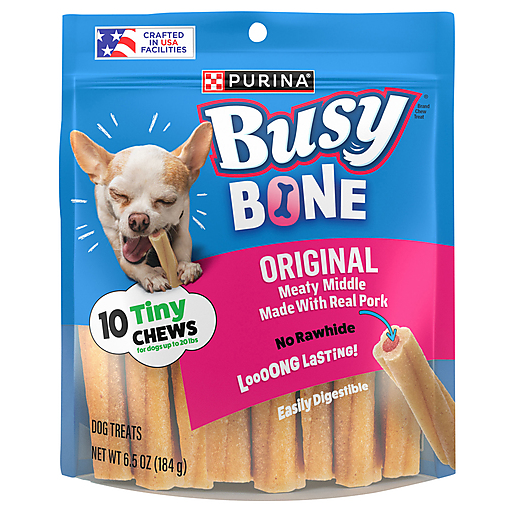 Keep your tiniest of tiny dogs entertained with Purina Busy Bone Tiny adult dog chew treats. Made with real meat in the center, these chewy bones let him know how much you care. Designed especially for a tiny dog's small mouth, each Purina Busy Bone Tiny adult dog chew treat has a unique twisted shape to add to your dog's chewing pleasure. Watch his excitement as he gnaws to his heart's content, savoring the exterior before reaching the bold, meaty reward in the center. Since these treats are made without artificial flavors, you can feed them without worry. Help him occupy his time and satisfy his need to chew when you need to get work done or give him a Purina Busy Bone Tiny adult dog chew treat as a special reward. Made without rawhide, these treats encourage your dog to chew, which helps keep his teeth clean. Relieve his boredom and keep him busy when you can't by offering him one of these tempting dog treats on a regular basis.