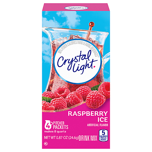 Crystal Light Raspberry Ice Powdered Drink Mix is a deliciously fruity drink with a raspberry flavor you can enjoy anywhere. With zero grams of sugar and 5 calories per serving, Crystal Light is a sweet alternative to juice and soda and has 90 percent fewer calories than leading beverages (this product 5 calories, leading beverages 70 calories), so you dont have to choose between taste and calories. The four pitcher packs in this 0.87 ounce container come perfectly portioned, so you can mix up a pitcher of Crystal Light powdered fruit drink mix easily and keep it on hand in the fridge. All the flavor and only 5 calories per serving... just the way you like it.